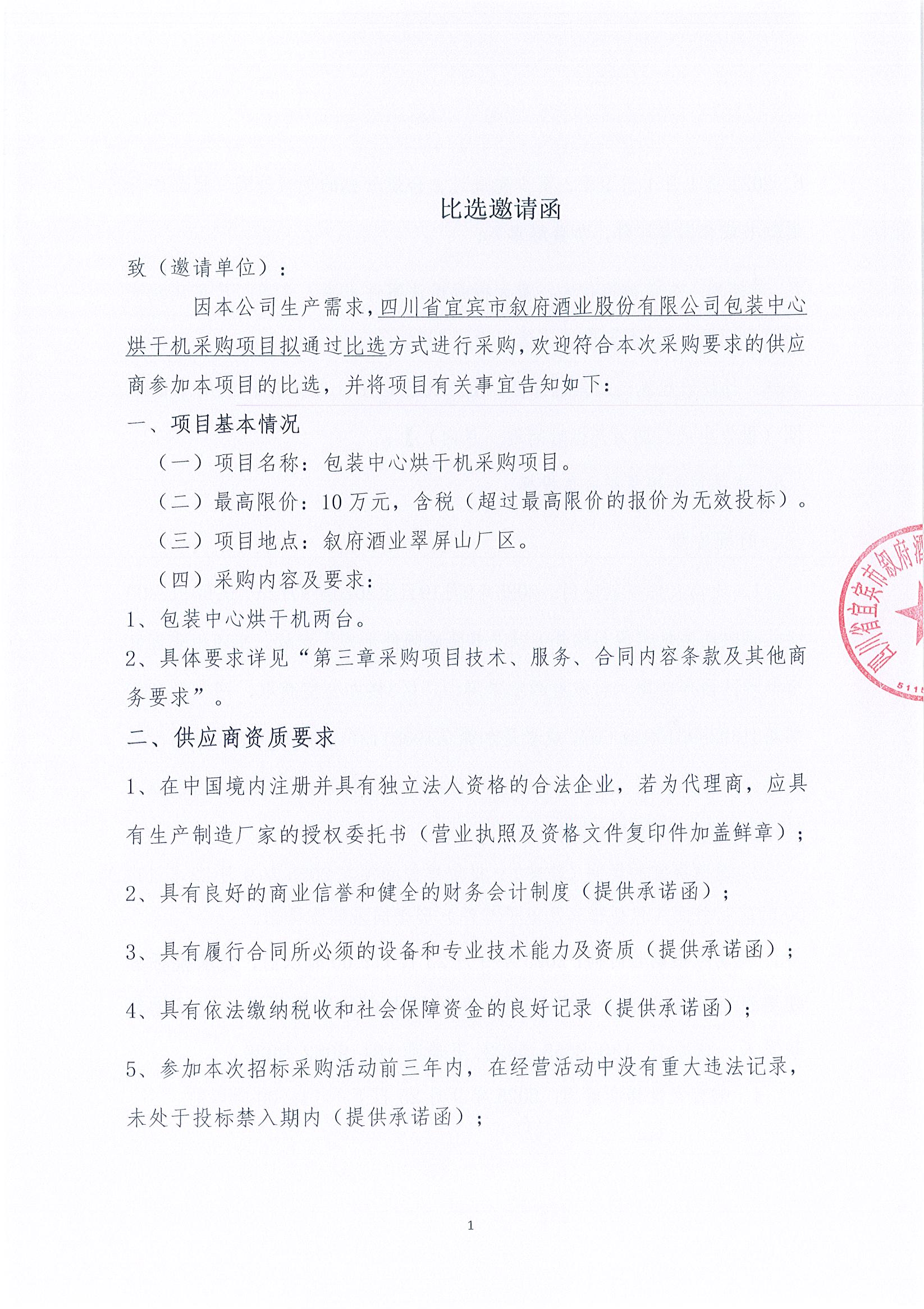 四川省宜賓市敘府酒業(yè)股份有限公司包裝中心烘干機(jī)采購項目比選招標(biāo)公示公告