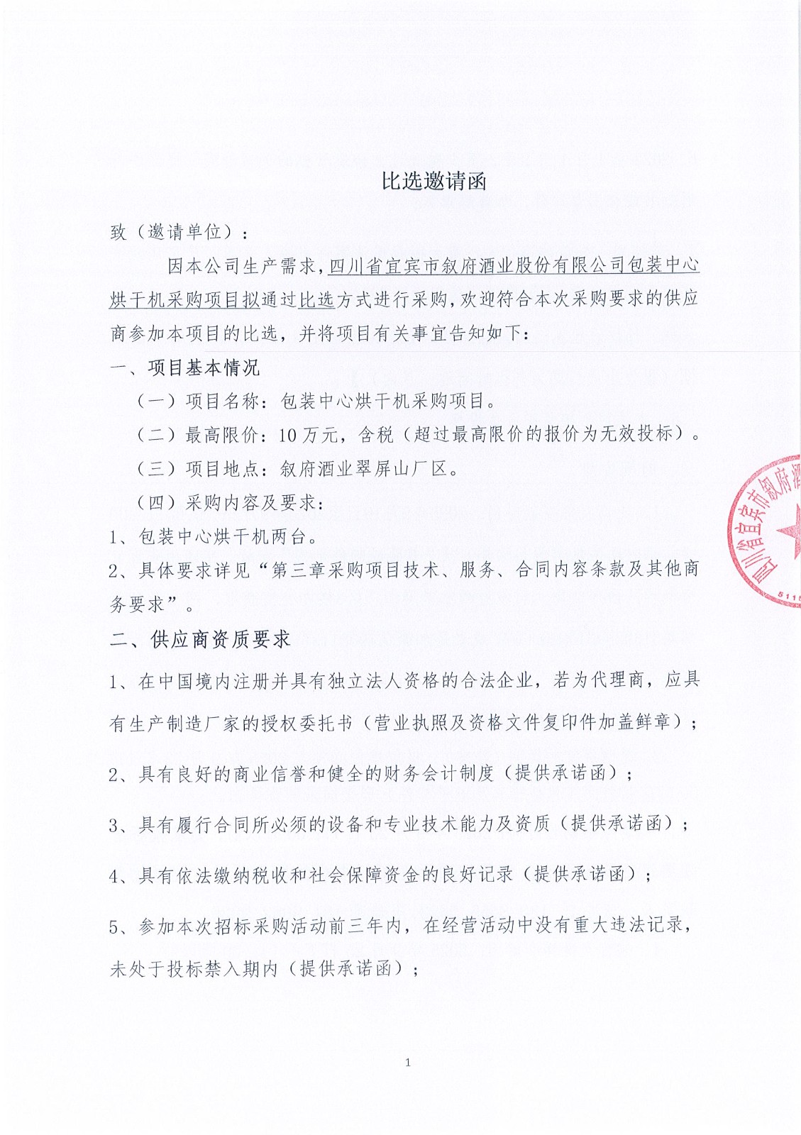 四川省宜賓市敘府酒業(yè)股份有限公司草簾采購項目比選結果公示