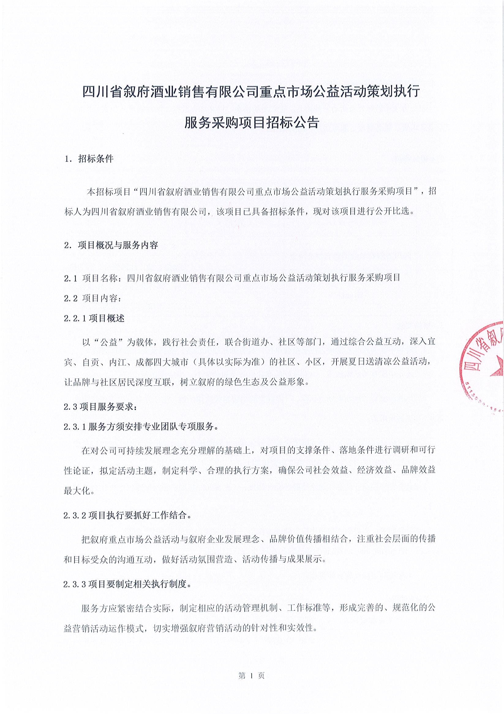 四川省敘府酒業(yè)銷售有限公司重點市場公益活動策劃執(zhí)行服務采購項目招標公告