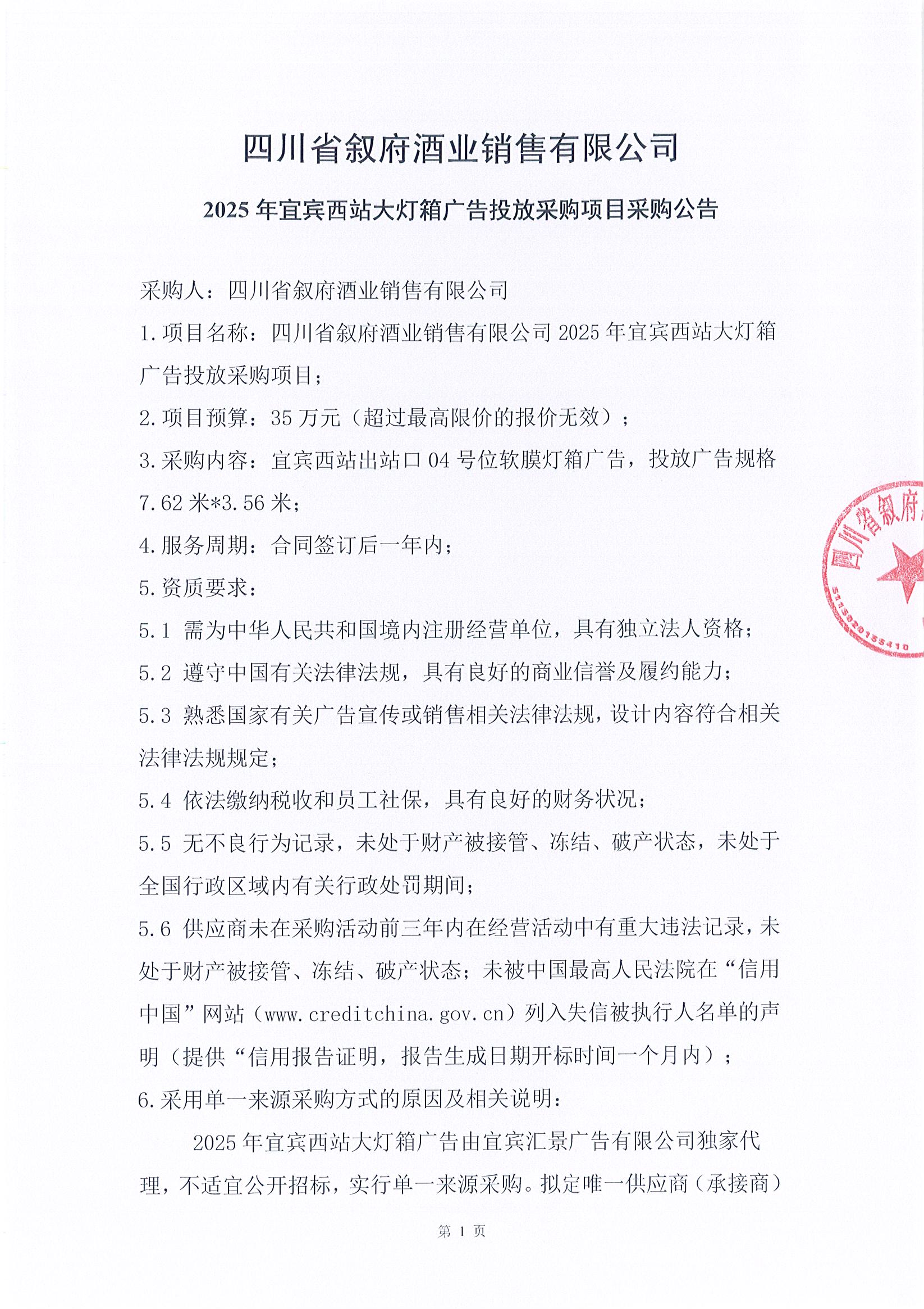 四川省敘府酒業(yè)銷售有限公司2025年宜賓西站大燈箱廣告投放采購(gòu)項(xiàng)目單一來(lái)源采購(gòu)結(jié)果公示公告